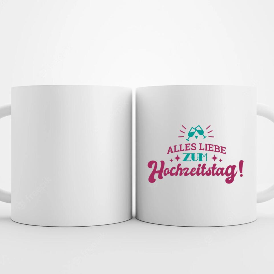Geschenk Tasse bedrucken und auf originelle Weise zum Jubiläum gratulieren. Machen Sie Ihren Eltern oder Freunden zum Hochzeitstag eine Freude. Die Jubiläumstasse zeigt auch die Champagnerzeit an. Finden Sie ein Foto des Paares, das seinen Hochzeitstag feiert, und platzieren Sie es auf der anderen Seite der Tasse.
