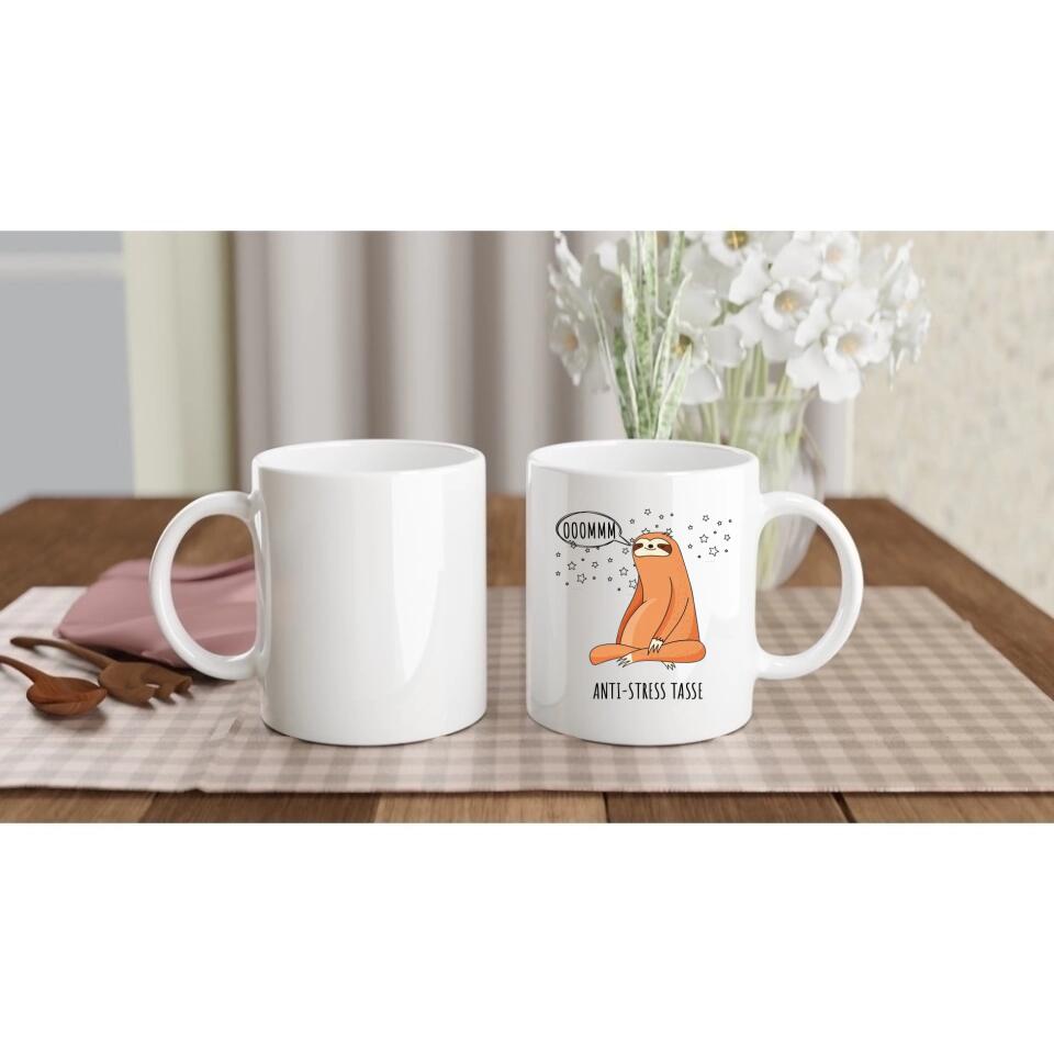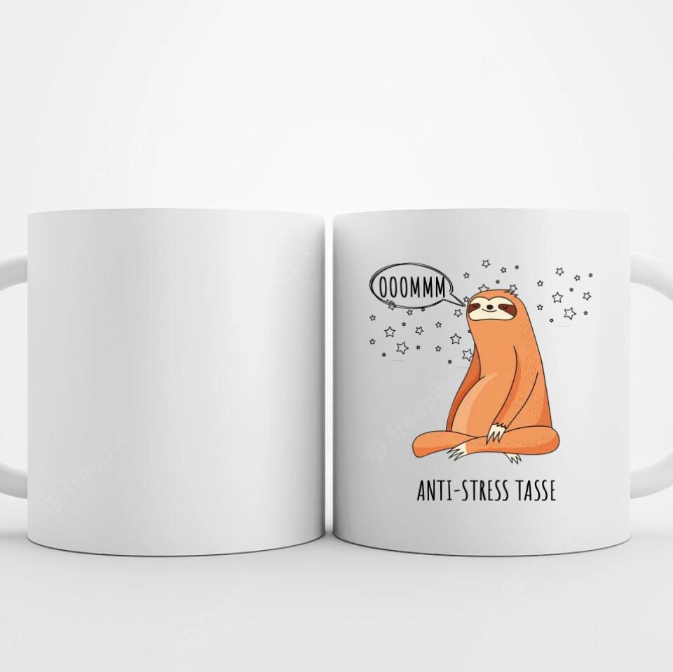 Die Tasse zeigt ein meditierendes Faultier unter einem Sternenhimmel, das den Klang OM singt, um sich zu entspannen.