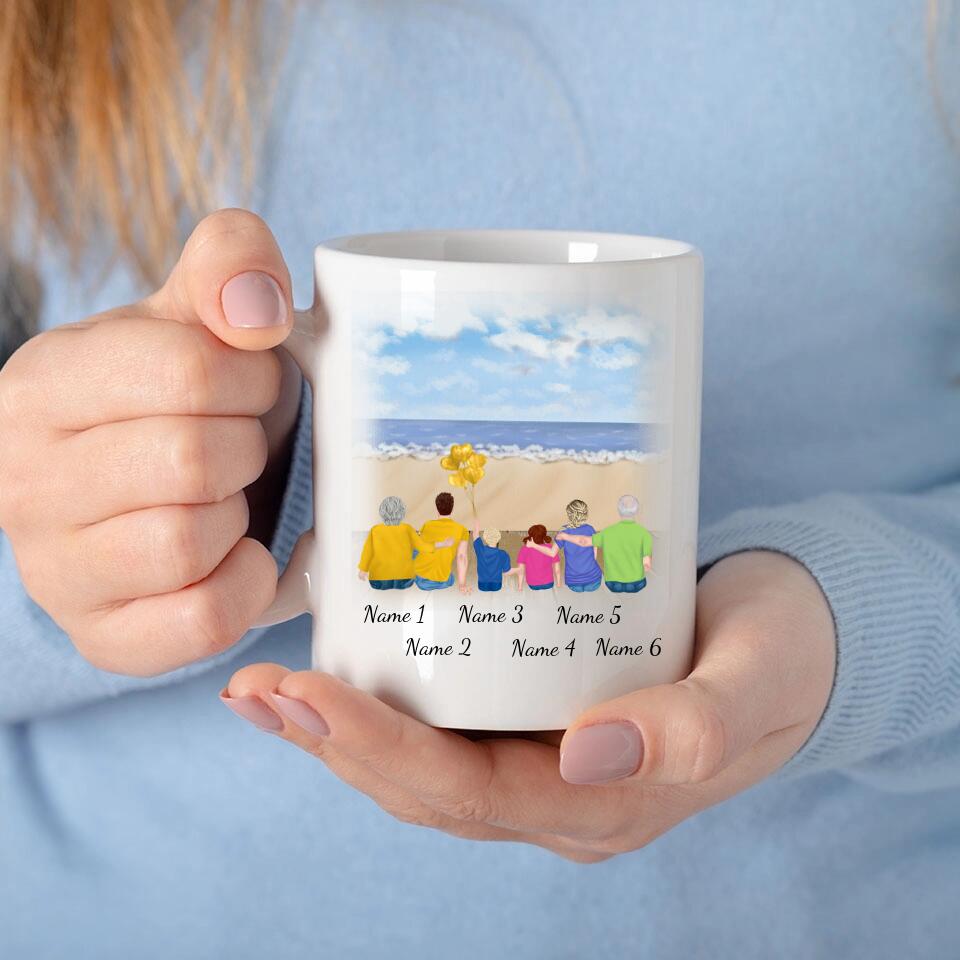 Eine personalisierte Tasse für die ganze Familie. Wählen Sie die Anzahl, die Frisuren, Haarfarbe, Kleidung auf der Familientasse und die Namen aller Familienmitglieder und einen der Hintergründe als Umgebung.