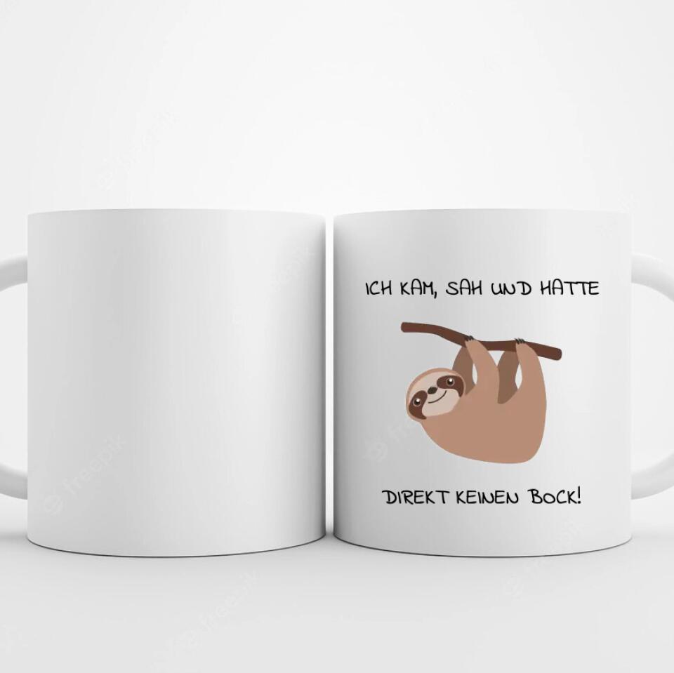 Tasse mit einer Zeichnung eines Faultiers, das sagt: "Ich kam, sah und hatte direkt keinen Bock!"