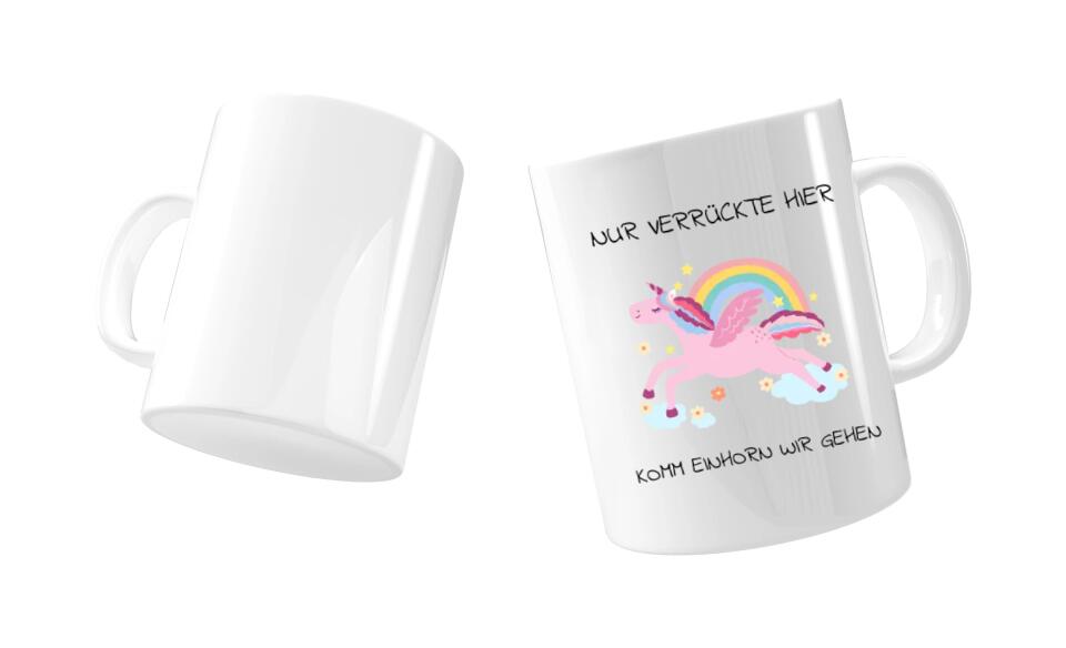 Der Satz "Nur verrückte hier komm Einhorn wir gehen" ist eine humorvolle Art zu suggerieren, dass die Person, die aus dieser Tasse trinkt, ein bisschen unkonventionell oder "verrückt" ist.