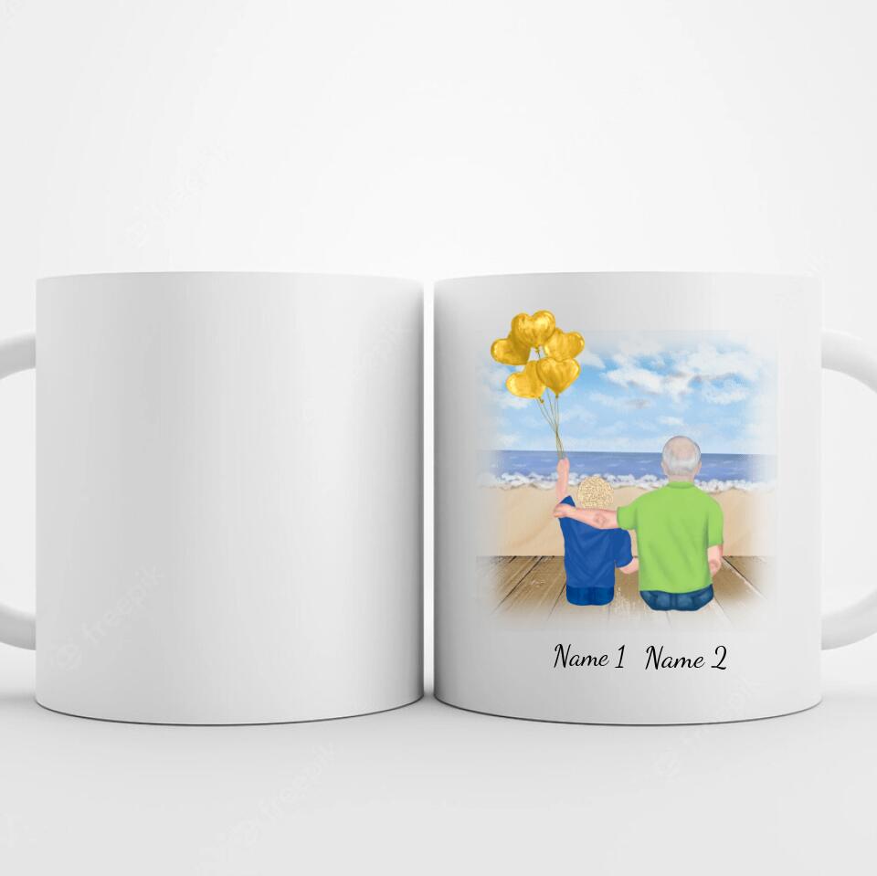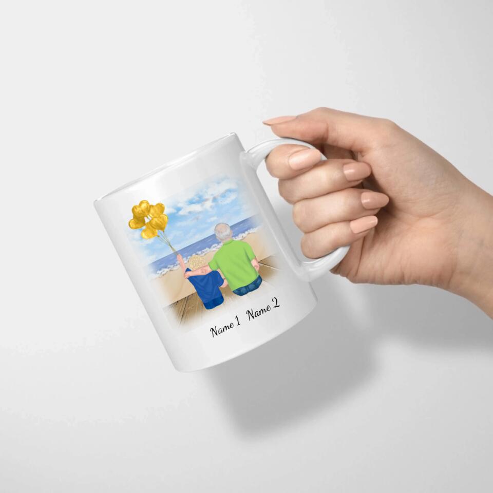 Eine personalisierte Tasse, die einen Enkel mit seinem Helden darstellt. Die Bindung zwischen Opa und Enkel ist etwas Besonderes, und diese personalisierte Opa Tasse ist ein intimes und besonderes Geschenk für jeden Großvater.