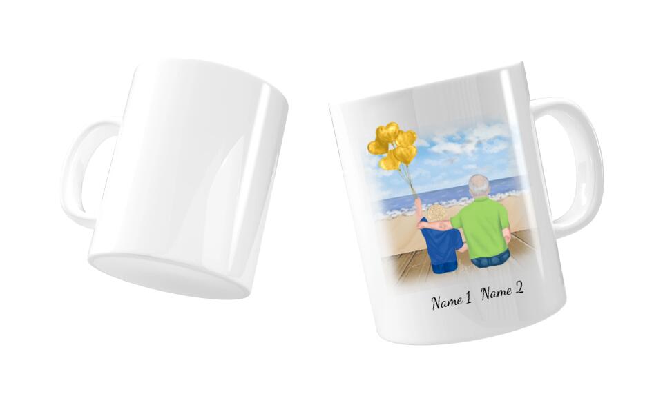 Auf der Tasse ist eine Illustration eines Großvaters und eines Enkels, die am Ufer eines Sees sitzen und sich umarmen. Unten ist Platz für ihre Namen oder eine Nachricht.